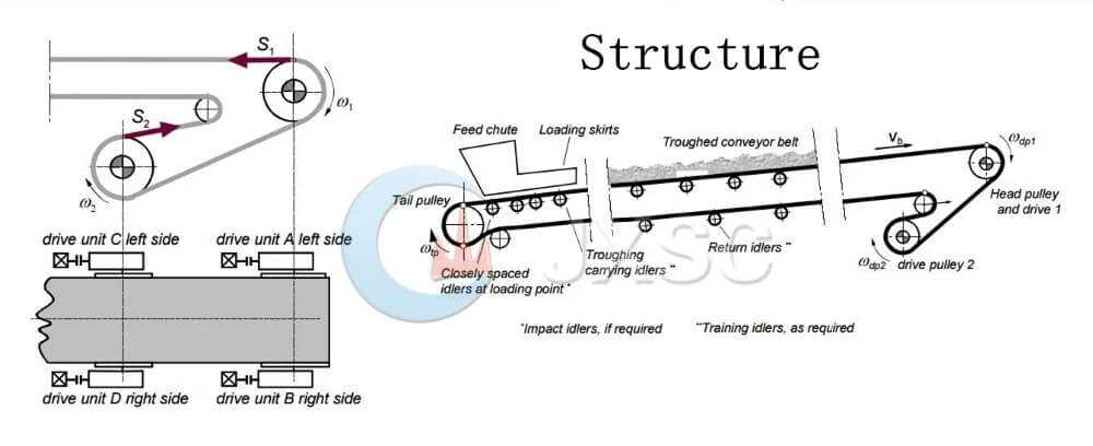 - Pulleys The conveyor belt forms a loop. The carry side transports the load and the return side allows continuous cycling of the belt. The pulleys allow the belt to change direction at the loading and discharge ends, as well as direction changes on the return side.