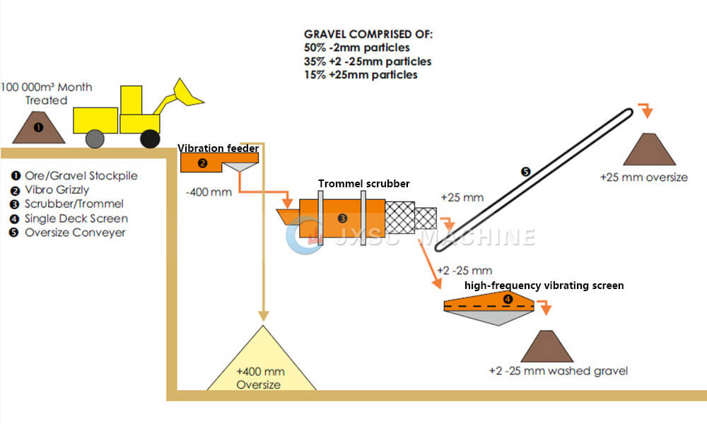 Customer need to wash the diamond ore, and separate the needed particles 2-25 mm, other sizes are not needed, so the process flowchart is as follows: