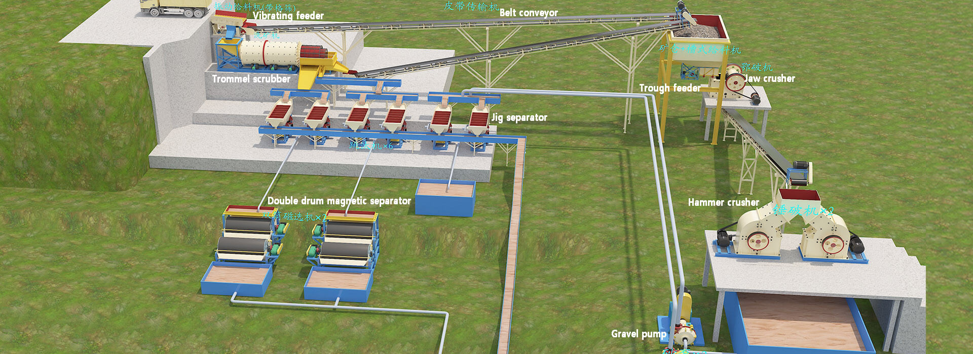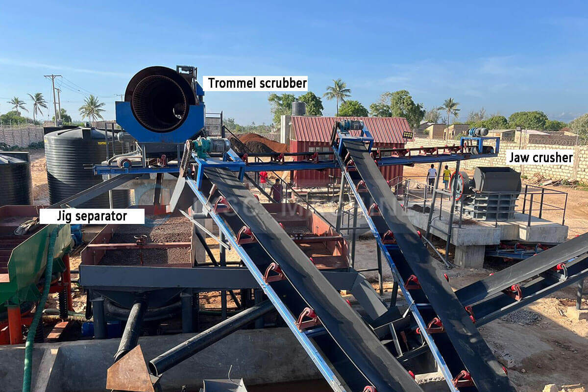 (4). The content of the 2-20mm part is also about 33%, which is fed into the 3rd and 4th jigs for gravity separation with a connecting steel chute. The larger 20-75mm size is transported to the hopper before the crusher and mixed with particles > 75mm. Below the hopper, a trough feeder is used to feed the material into a jaw crusher to be crushed into material less than 40mm; then it is transported to two hammer crushers for fine crushing. The discharge will be pumped to the 5th and 6th jigs by a mud pump.