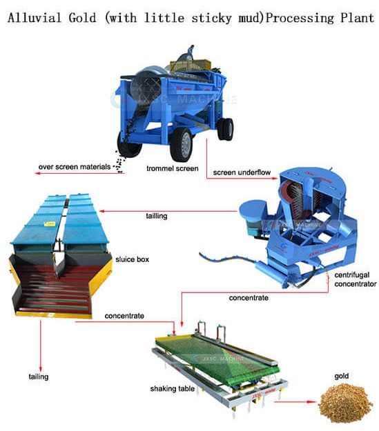 100TPH Alluvial/Placer Gold Recovery Process Plant: trommel screen (remove a small amount of soil impurities), gold centrifugal concentrator, six sluice boxes, a shaking table, and two belt conveyors.