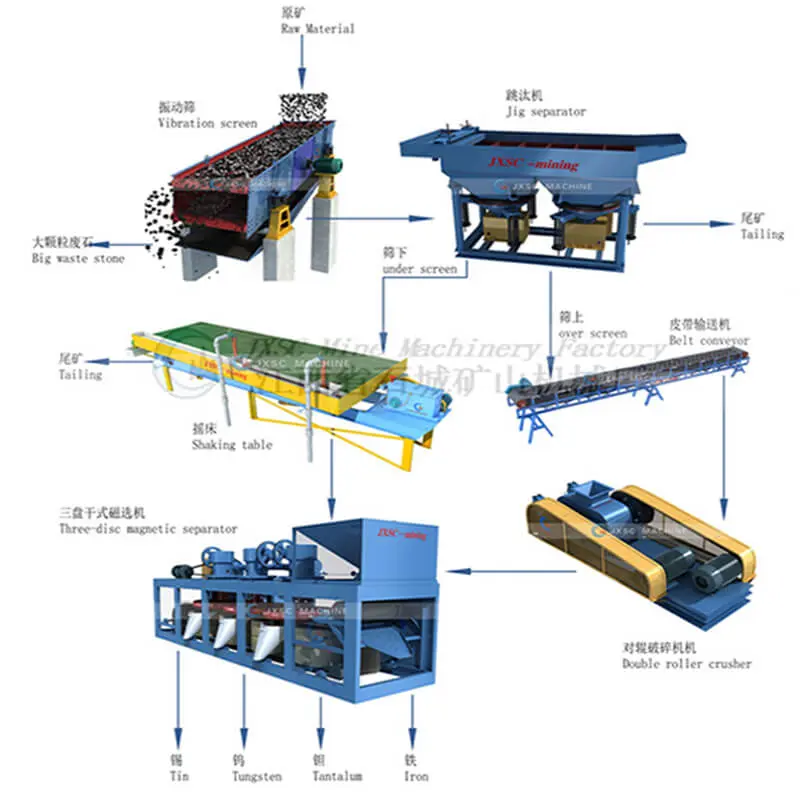 JXSC tungsten ore processing plant solutions cover crushing, grinding, gravity (wolframite), flotation (scheelite), and magnetic separation, etc. And can be customized as per request, such as 10tph, 50tph, 100tph, or more.